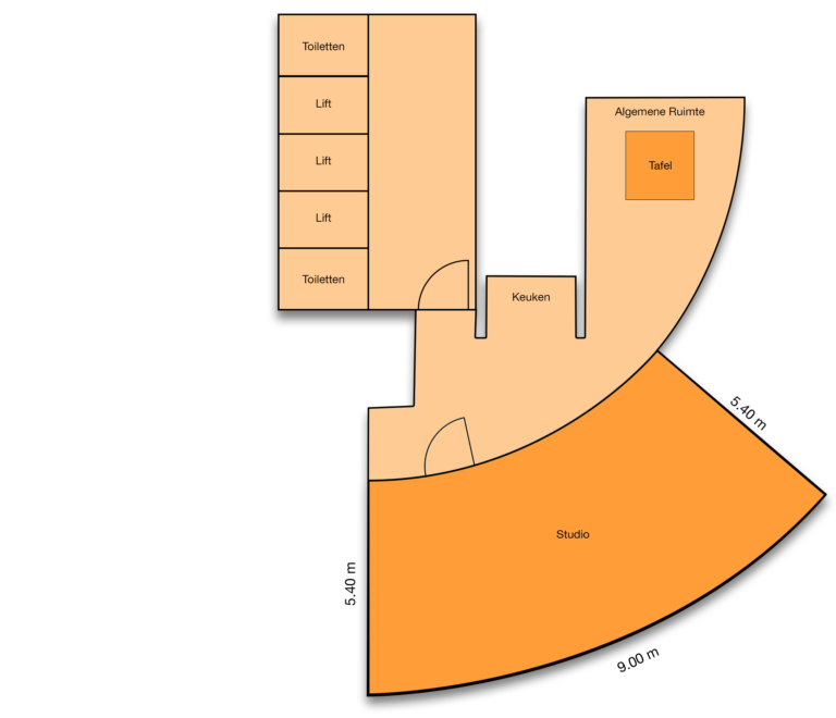 Naast de studio is er ook een aparte keuken, toilet en een ruimte geschikt voor bijvoorbeeld lunch, visagie of ontvangst.